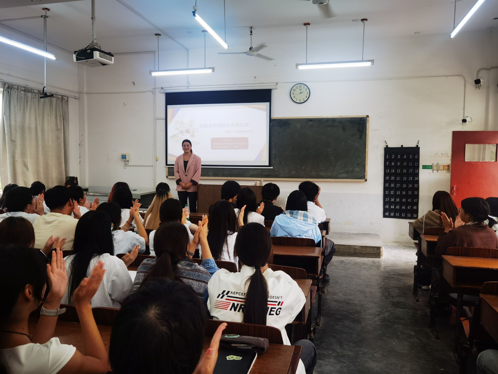 讲座中,吴开美结合十六年行业深耕经验,从“行业现状—挑战机遇—能力培养”三方面展开分享。她以“老年化旅游市场崛起”“大数据赋能文旅”“文旅+融合创新”等趋势为切入点,剖析了旅游业从“资源驱动”向“创新驱动”的转型逻辑,重点解读了“新零售+新旅游”“数字化营销”等行业升级路径。针对新生关切的职业规划,她建议构建“T型知识结构”:既要夯实旅游管理核心课程基础,考取导游证、教团队格证等职业证书,也要主动涉猎数据分析、新媒体运营等跨界技能,通过参与“三下乡”实践、校企合作项目积累实战经验。