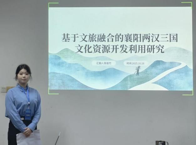陈俊竹同学分享了“襄阳文化旅游纪念品创新设计研究”,重点分析了两汉三国文化资源开发成效,并提出了特色文旅品牌打造的具体建议。她认为,文化旅游纪念品是传播地方文化的重要载体,要注重纪念品的文化内涵和创意设计,开发出具有襄阳特色和市场竞争力的旅游纪念品。